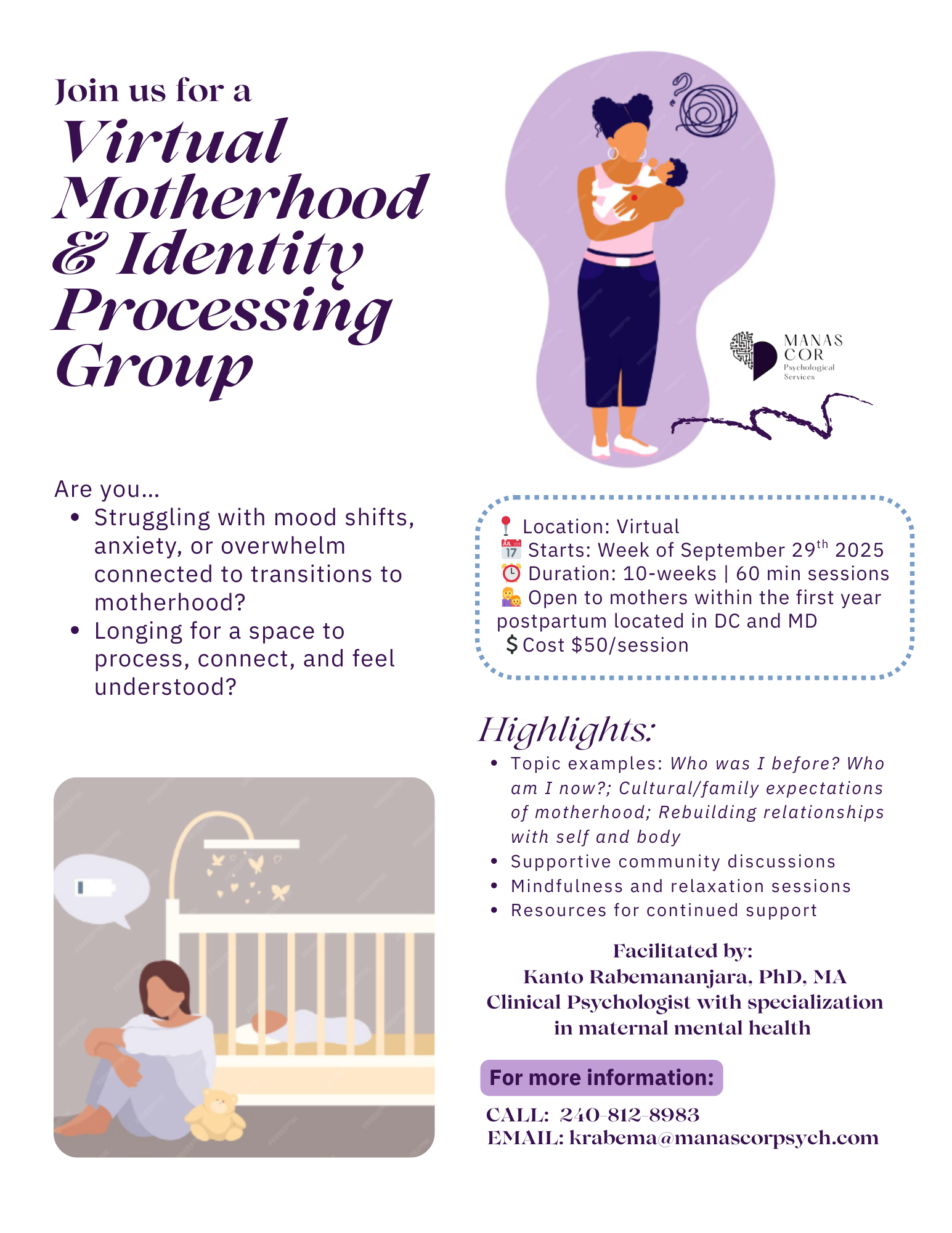 The Motherhood & Identity Processing Group explores identity around new motherhood through supportive community discussions, mindfulness and relaxation sessions, and resources for continued support.